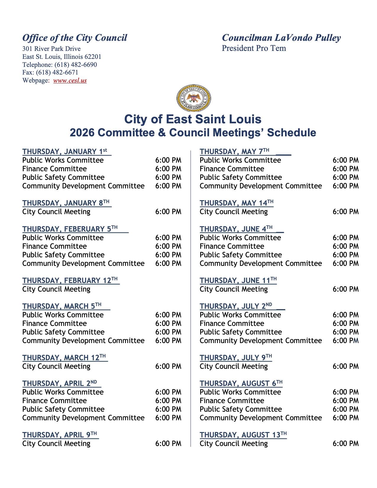 The City of East St. Louis has released the 2026 City Council and Committee Meetings Schedule.